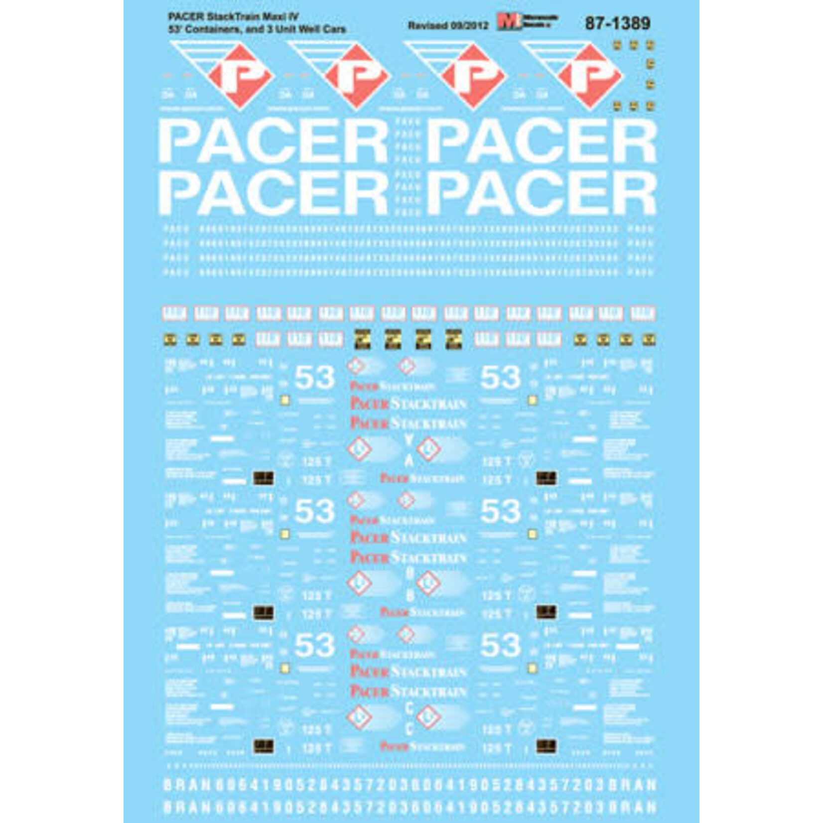 87-1389 HO Scale - PACER Stack Train Maxi IV-53' Containers and 3 Unit Well Cars Decals